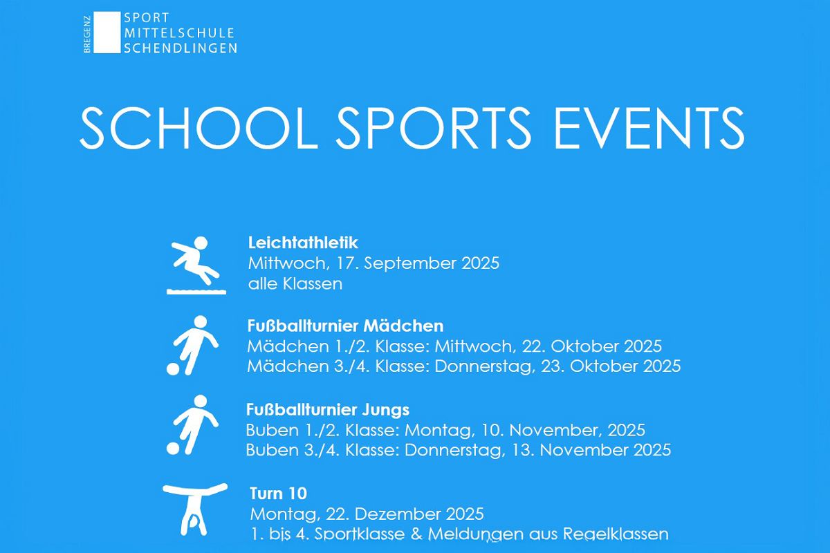 Wir freuen uns sehr, dass die traditionellen Schoolsportevents an der Mittelschule Schendlingen heuer wieder stattfinden. Auf dem Programm stehen abwechslungsreiche Wettkämpfe und Aktivitäten, die allen Klassen die Möglichkeit bieten, aktiv teilzunehmen und den Gemeinschaftsgedanken zu stärken. Das allererste Schoolsportsevent - der Leichtathletik-Schulwettkampf - fand heuer ja bereits statt, die Vorbereitungen für die nächsten schulinternen Wettkämpfe laufen bereits auf Hochtouren und die Vorfreude ist groß. Wir laden alle herzlich ein, sich die Daten vorzumerken und die Veranstaltungen zahlreich zu besuchen.