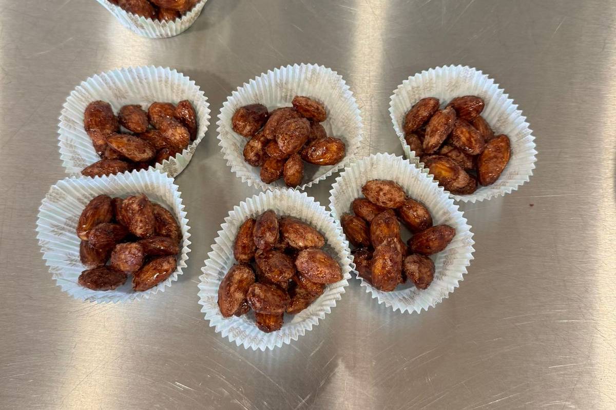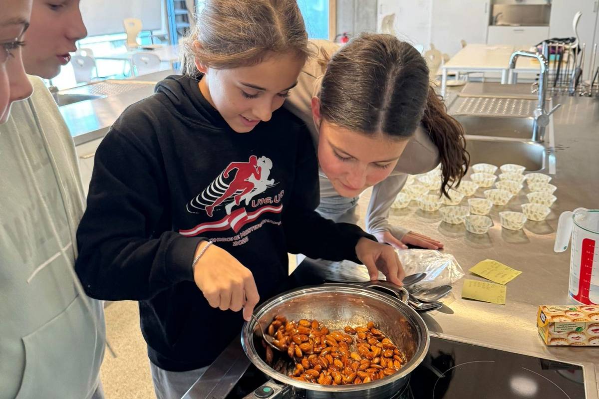 Als erstes haben wir in einer großen Pfanne Wasser, Zucker und etwas Zimt aufkochen lassen. Als wir dann die Mandeln hinzufügten und ständig umrührten, wurden die Mandeln mit einer glänzenden Karamellschicht überzogen. Nach dem Abkühlen durften wir unsere gebrannten Mandeln sofort probieren.