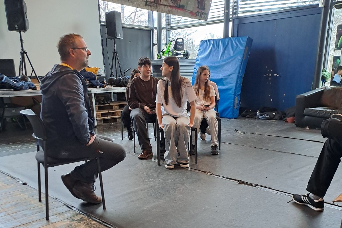 Schon die ganze Woche erarbeiten die Schüler:innen der 3b ein Stück, das am Freitag im Westend dann Premiere feiern wird. Unter der Anleitung und geschickten Führung durch Michael Schiemer vom Landestheater lassen sich die Schüler:innen auf Situationen ein, die ihnen bekannt sind, aber doch ungeahnte Gefühle wach werden lassen: „Was empfindest du wirklich in dieser Situation“, ist oft die Frage des Instruktors und dann wird es spannend – (fast) alles ist erlaubt, denn die Akteure sind Figuren auf der Bühne, die alles aussprechen, auch das, was man im normalen Leben für sich behalten würde – oder unhörbar für die anderen im Inneren Monolog für sich verbalisiert.